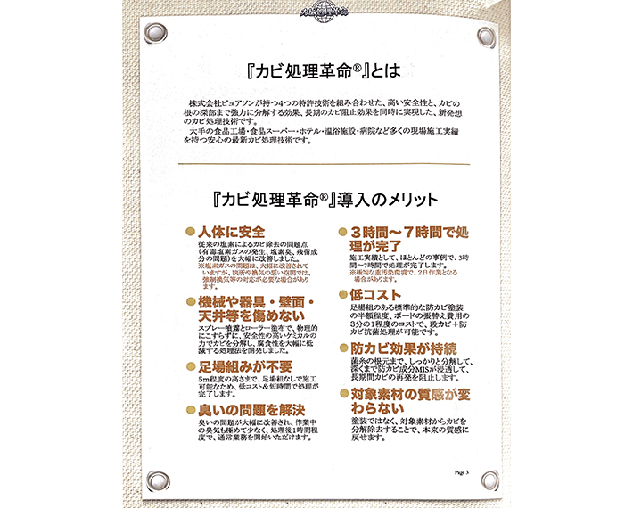 スプレー噴霧とローラー塗布で、物理的にこすらずに、安全性の高いケミカルの力でカビを分解し、腐食性を大幅に低減する処理法を開発しました。